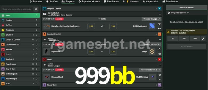O 999bb oferece uma grande seleção de opções de apostas em e-sports com probabilidades competitivas